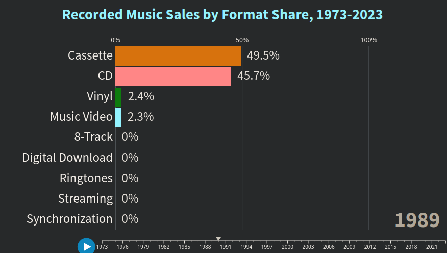 Au début des années 2000, les cassettes représentaient moins de 5% de parts du marché, pour atteindre moins de 1% des 2003. On peut noter que les CD pour moi sont une sort d'anomalie car jusqu'en 2011, il était le medium le plus utilisé pour l’écoute/achat de musique avec 43,5% de parts. De nos jours évidemment, il en est a moins de 4% (ce qui reste quand meme impressionnant).